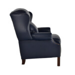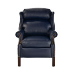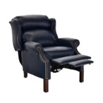 The Chippendale recliner is manufactured using a hardwood and engineered hardwood frame, with maple Chippendale leg, bustle back, loose seat cushion and nail head trim. Shown here in navy top grain leather but available in many other leathers.