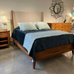Upholstery inside the headboard and shelter-style fins adds to this bed’s welcoming softness. The fins flow down to join solid-cherry rails whose ends sweep slightly upward. Bold but softly rounded moldings follow the lines of the base, and the legs are also smoothly radiused. The finished look is clean yet warm and inviting, with a hint of mid-century style.