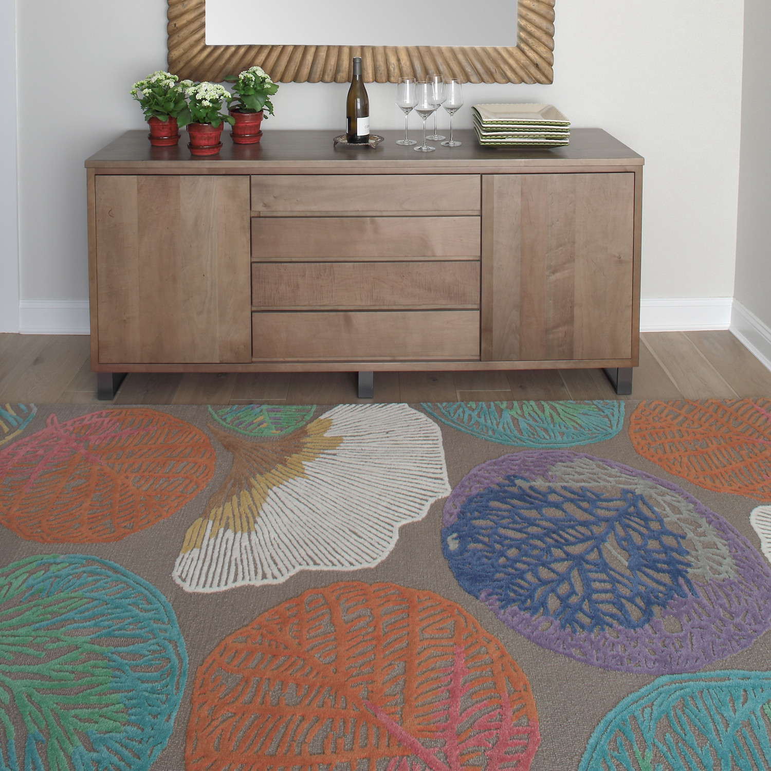 100% wool pile certified to the Responsible Wool Standard. Hand-tufted, 3/4″ cut and loop New Zealand wool pile. Made in India. Woven cotton backing.