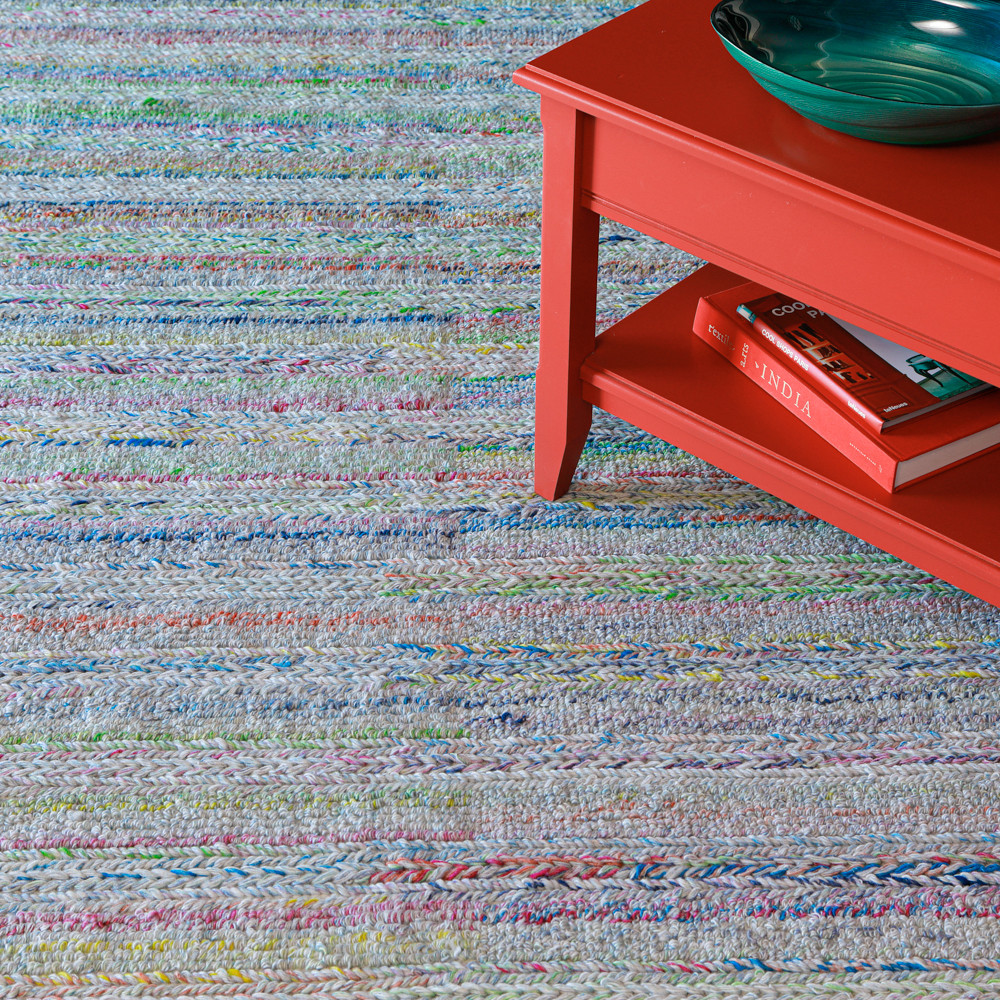 100% PET polyester, made from recycled plastic bottles. Hand-woven, 1/2″ loop pile. Made in India. No backing.
