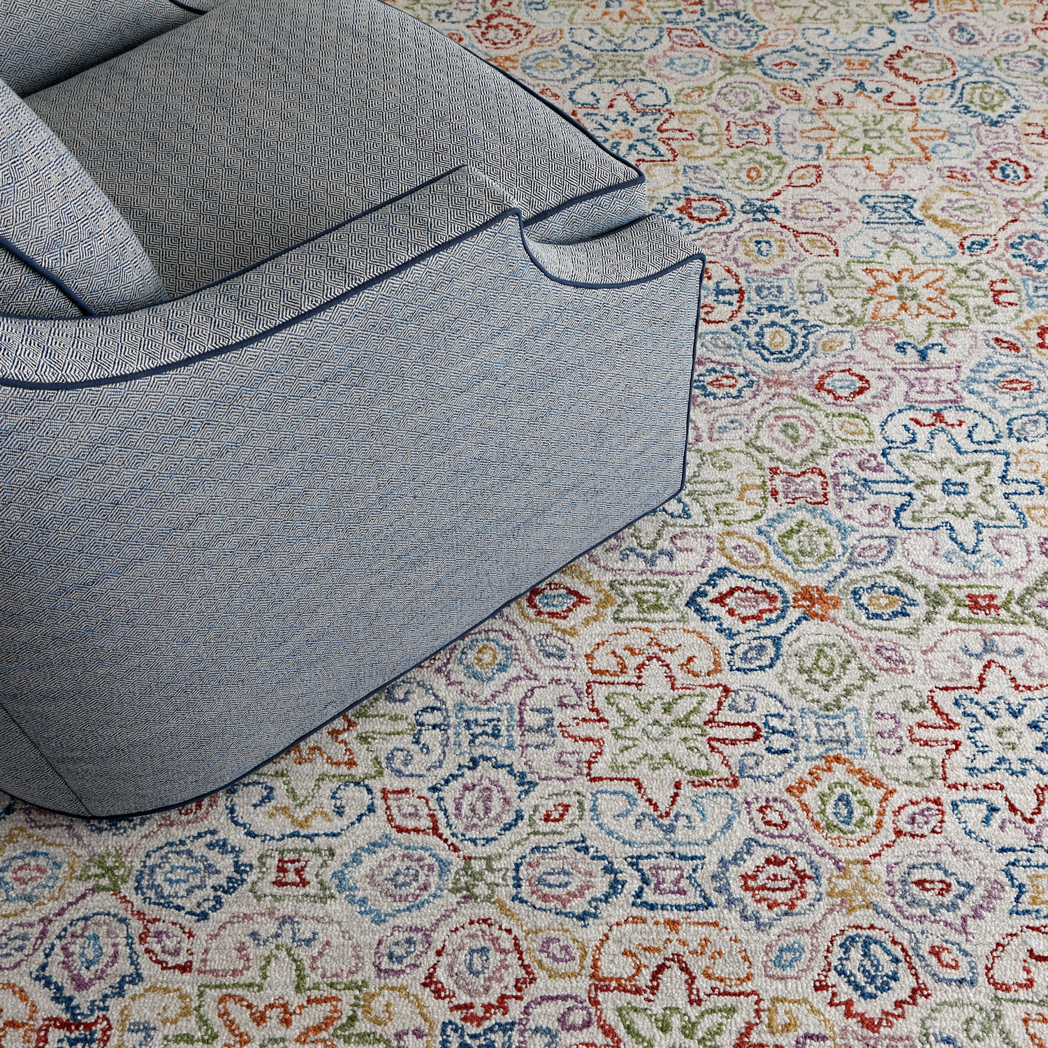 100% wool. Hand-tufted, 1/2″ loop pile. Made in India. Woven cotton backing.