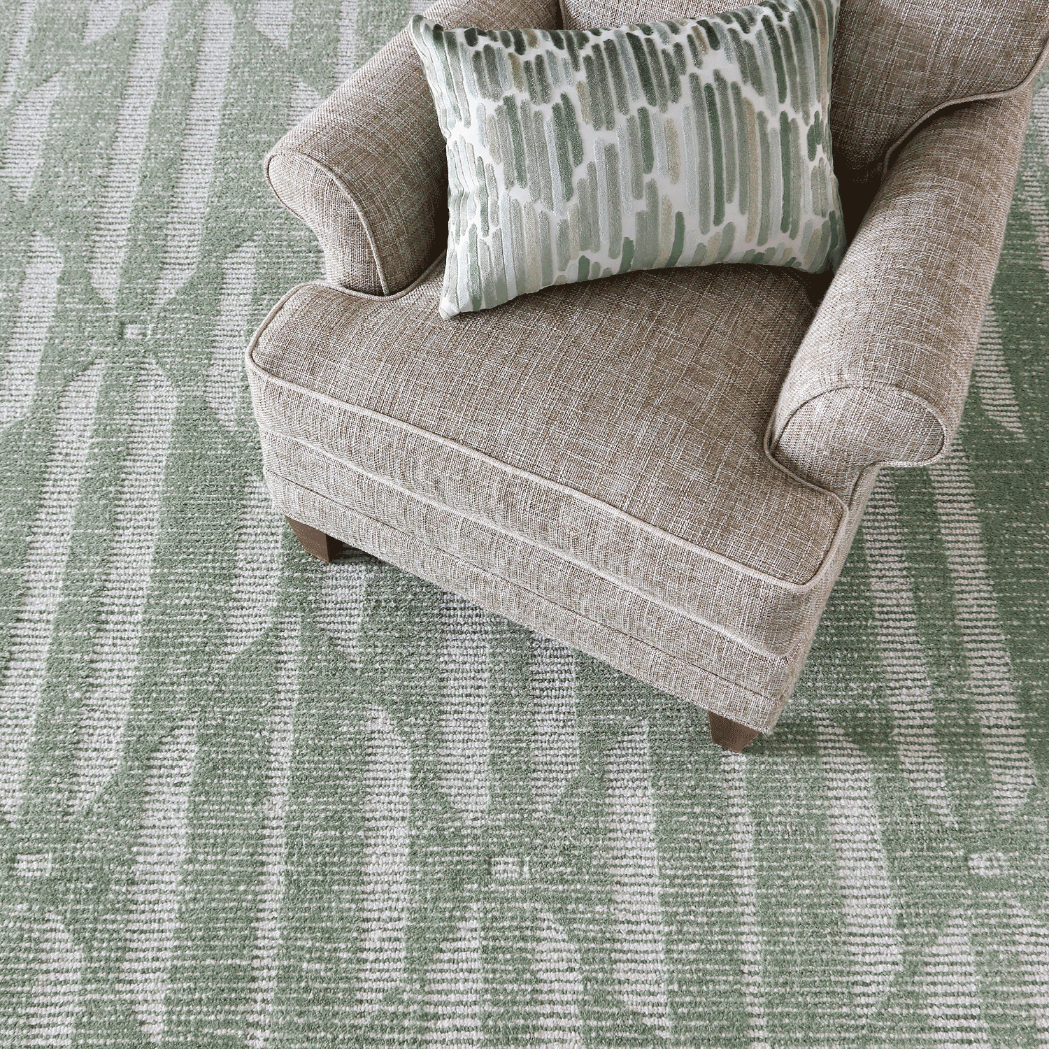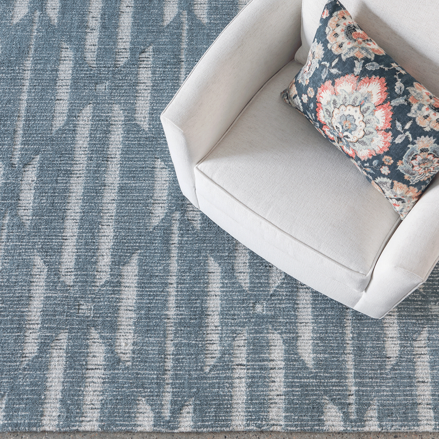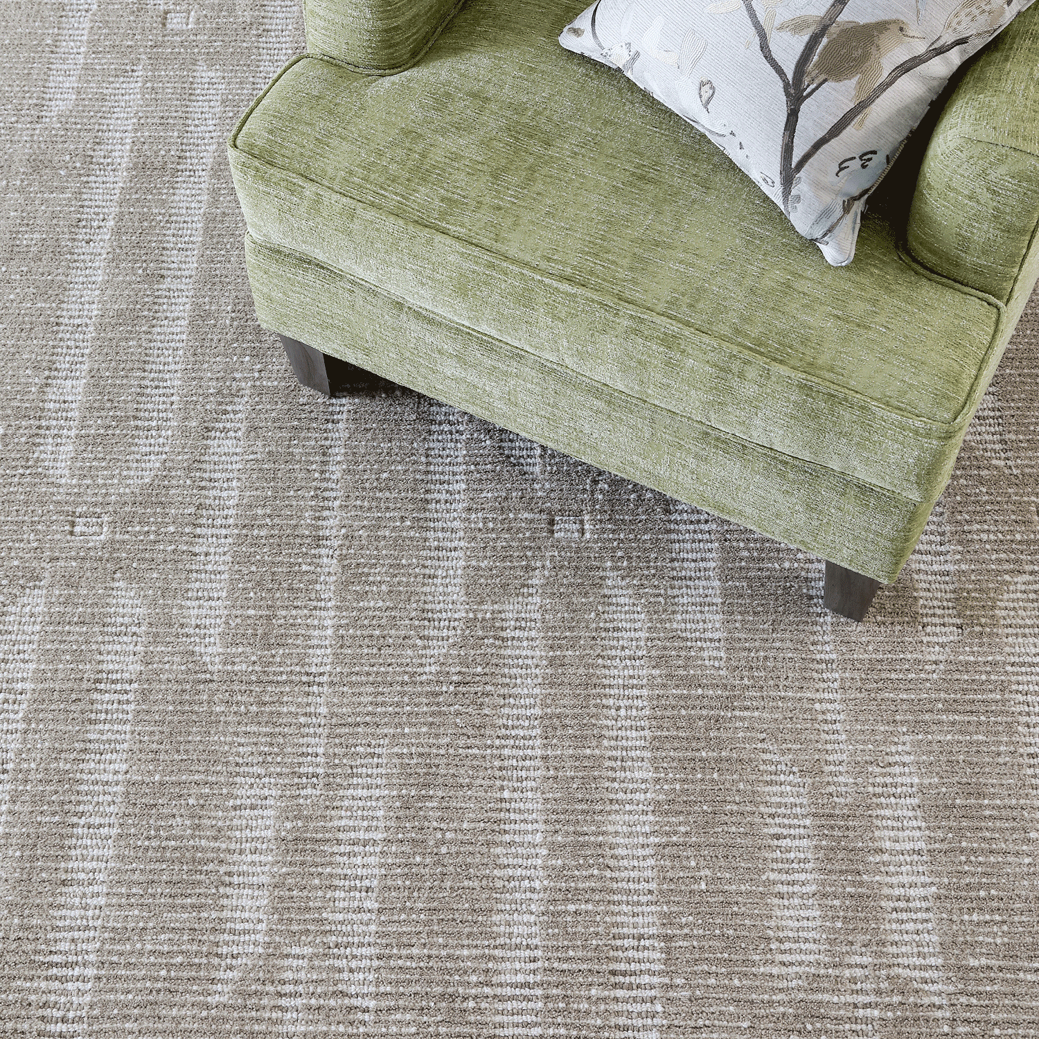 100% wool. Hand-tufted, 1/2″ cut and loop pile. Made in India. Woven cotton backing. Available in three colors: Sage, Sand, and Denim.