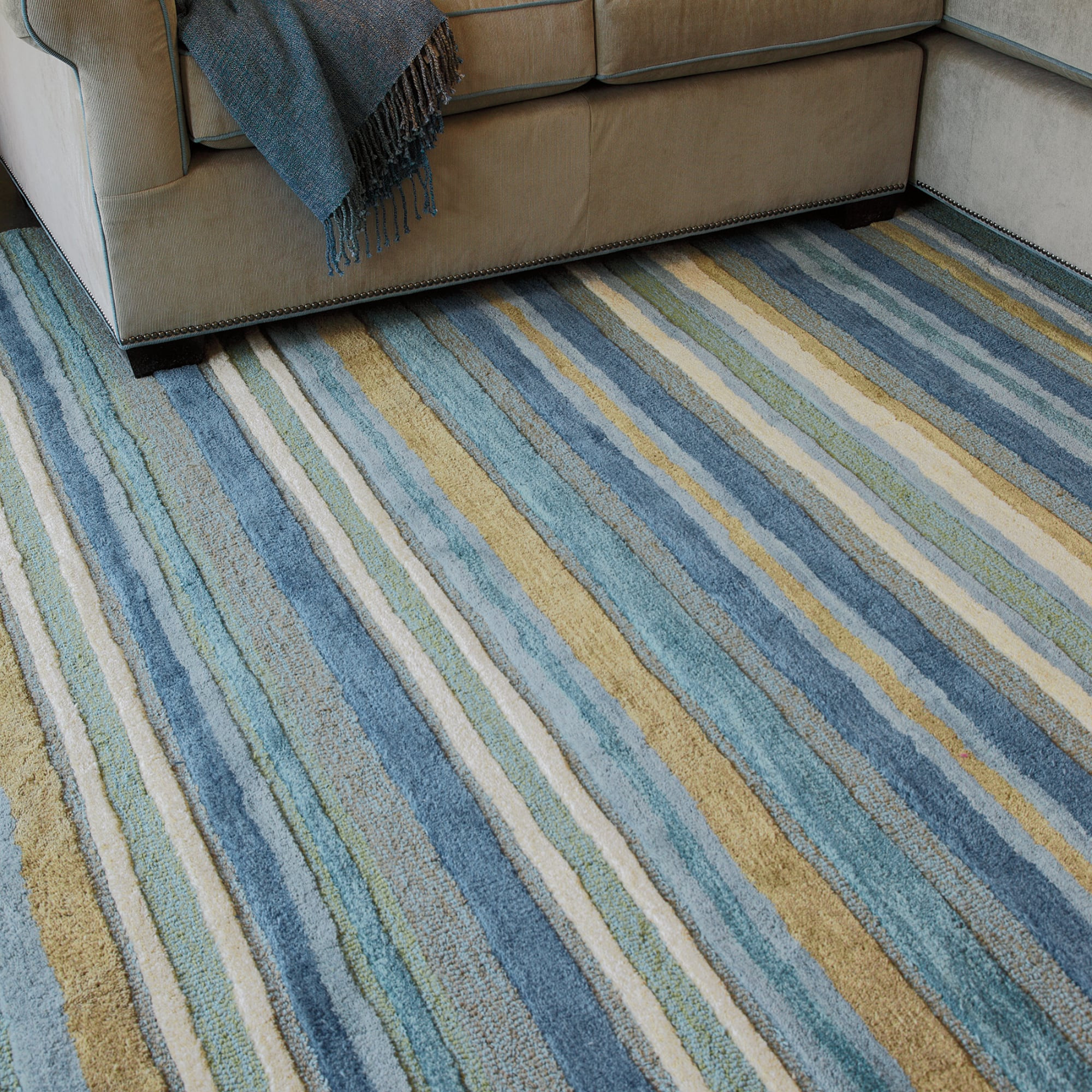 100% wool. Hand-tufted, 3/4″ cut and loop pile. Made in India. Woven cotton backing.